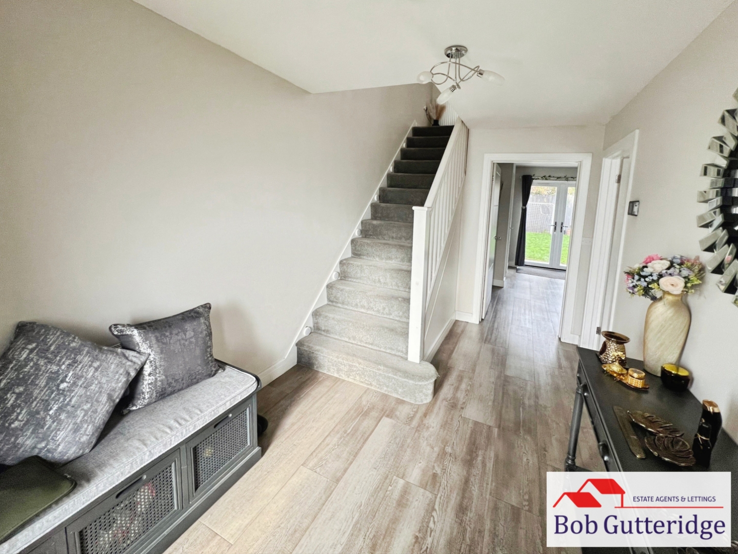 With composite frosted double glazed front access door, pendant light fitting, modern grey wood effect flooring, stairs to first floor landing and doors to rooms including;